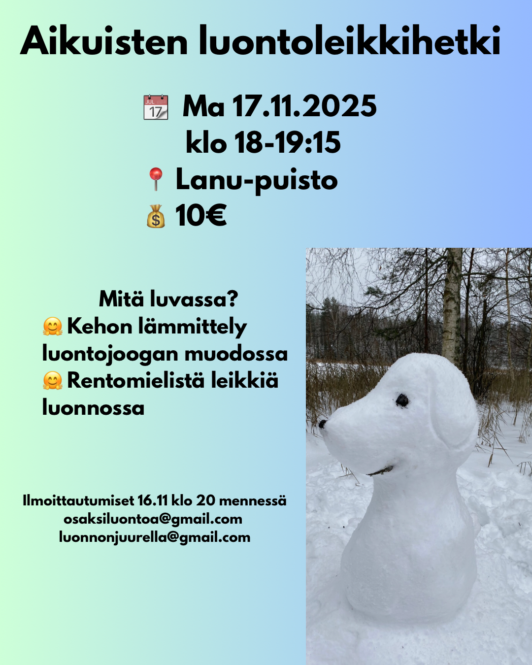Milloin olet viimeksi leikkinyt? Muistatko vielä sellaisia leikkejä kuin 10 tikkua laudalla, tervapata, väri, kirkkis? Aikuisuuden myötä useimmiten leikkiminen on jäänyt vähäiseksi tai jopa loppunut kokonaan. Mitäpä sanoisit, jos lähdettäisiin yhdessä herättelemään sisäistä lastamme ja lähtisimme yhdessä ulos leikkimään? Luontoleikkihetki aloitetaan pienellä kehon lämmittelyllä luontojoogan muodossa. Kun olemme saaneet kehon lämpimäksi, heittäydymme avoimin ja rennoin mielin jonkin leikin/leikkien pariin. Luontoleikkihetki lopetetaan yhteiseen